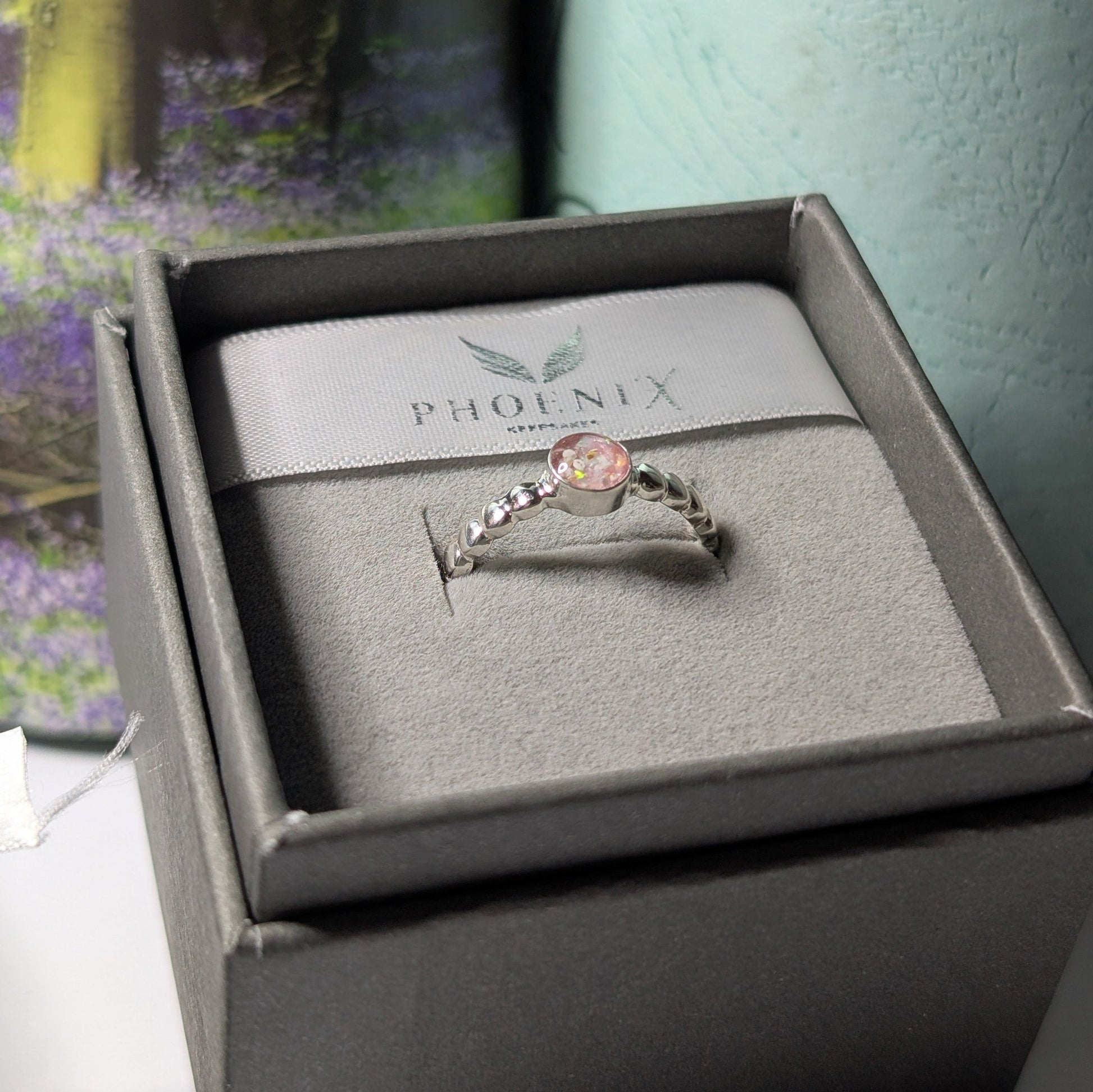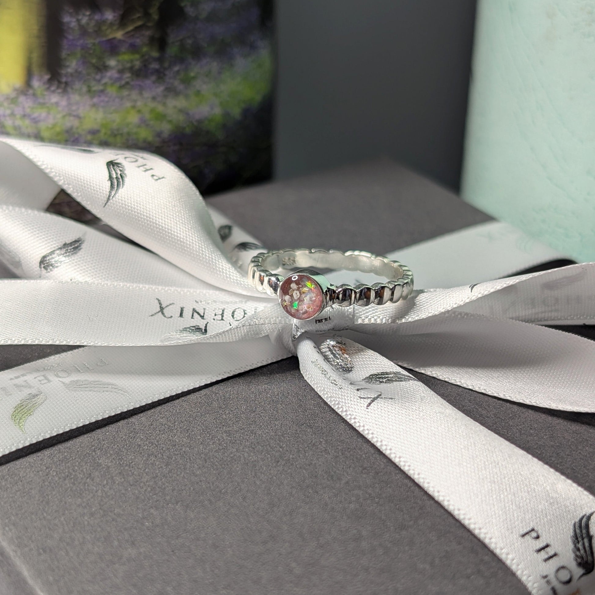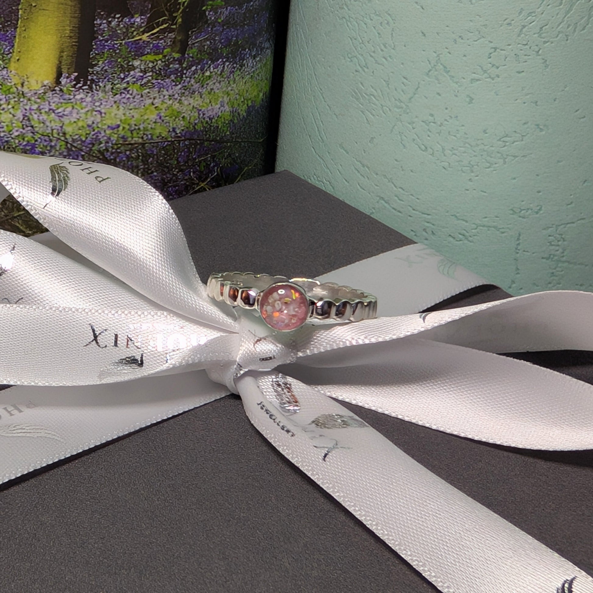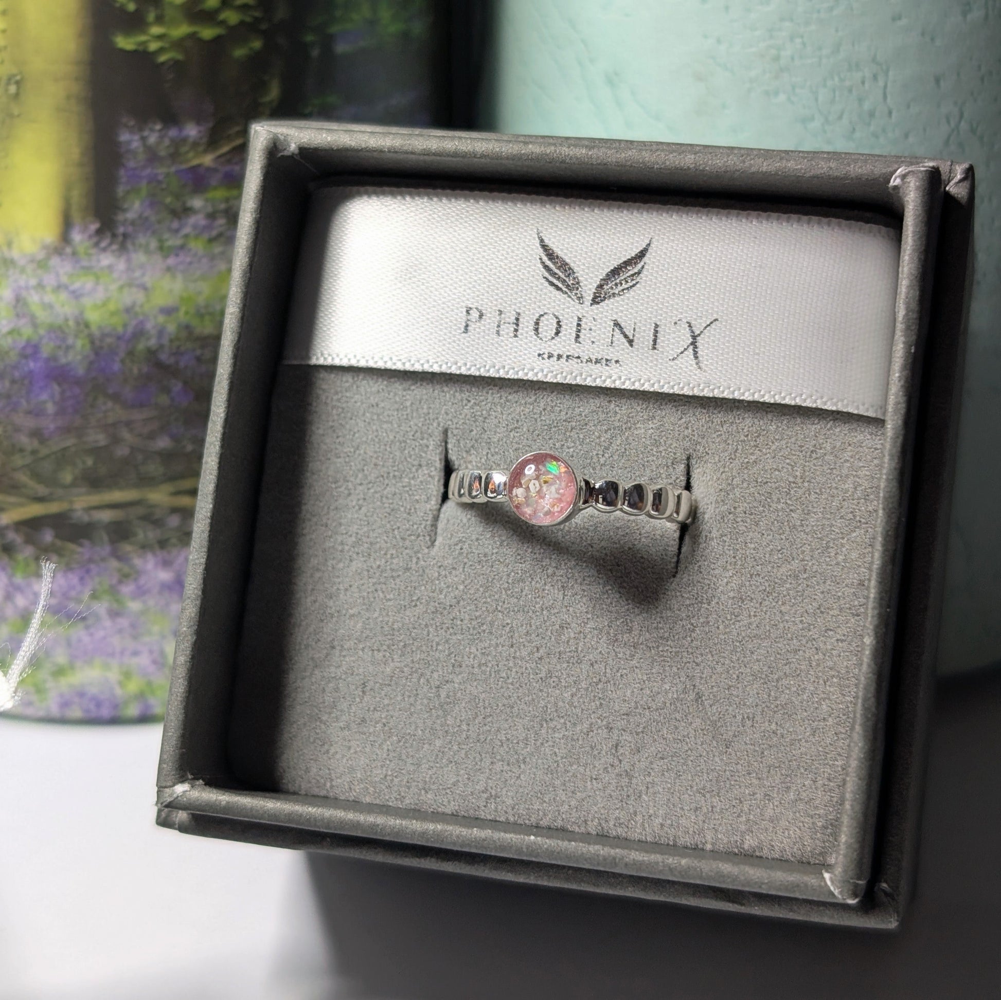 This ring can be personalised with a choice of background colours and you can also add a small amount of crushed crystal or opal chips with your cremation ash.
