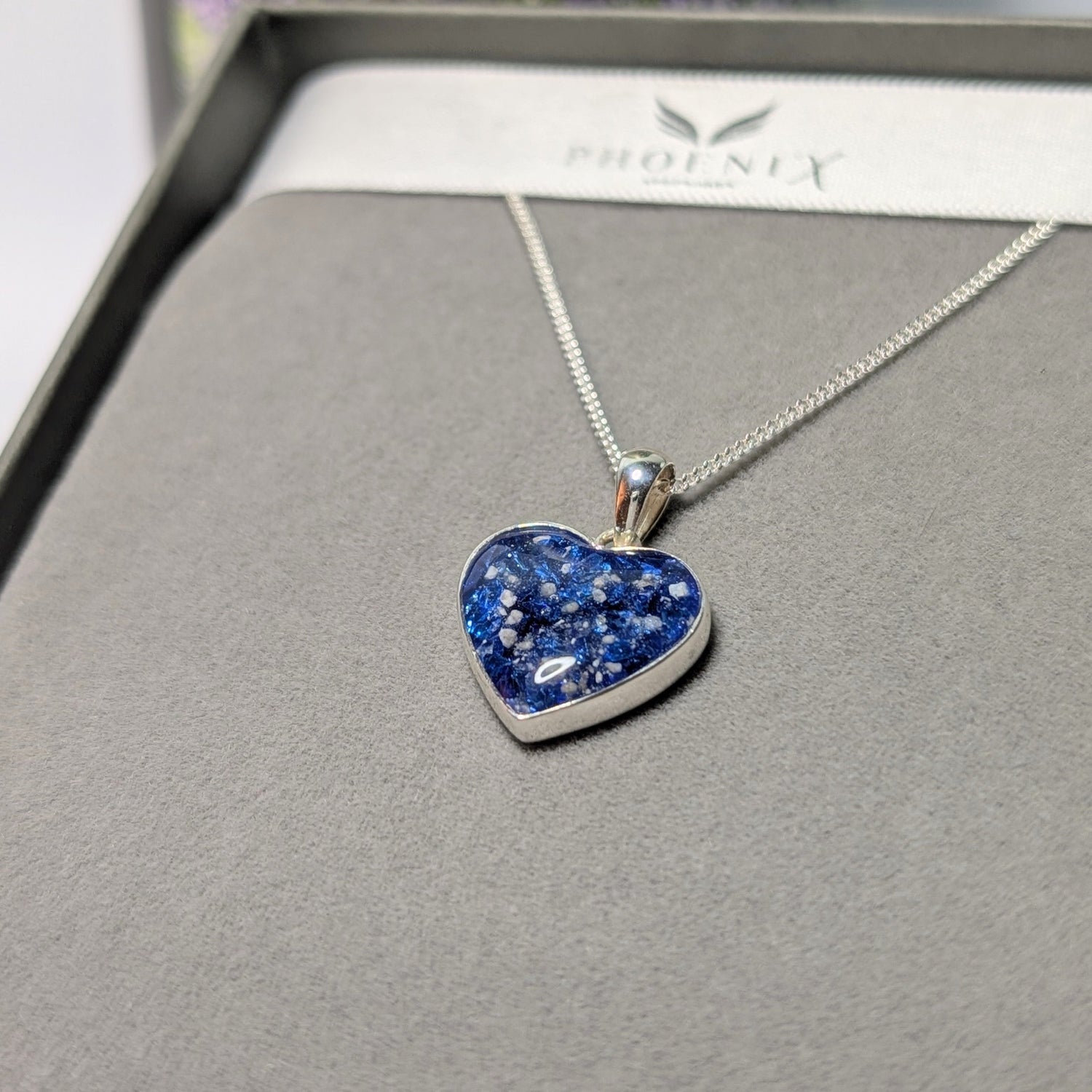 Cremation ash captured in crystal resin and set in stunning sterling silver jewellery. Colours and inclusions can be personalised for each individual piece.